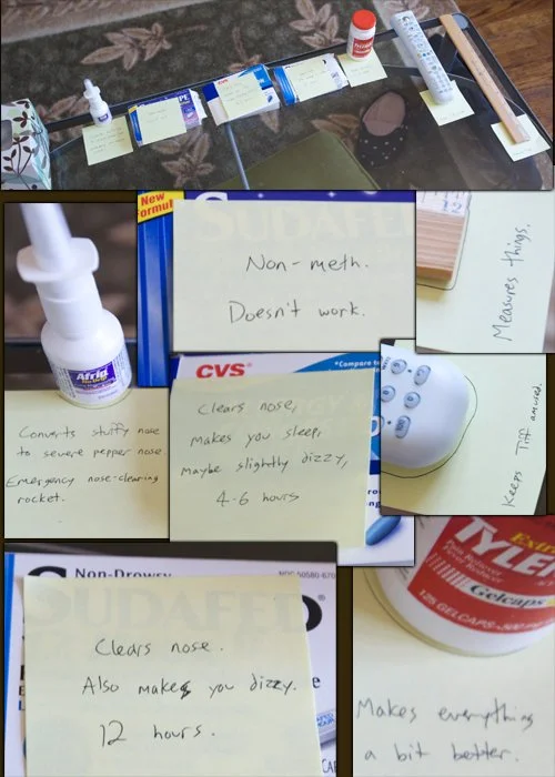 I’m home sick today and Marco left me this helpful feel-good buffet. Thanks for taking care of me while I have your bloaty head disease.